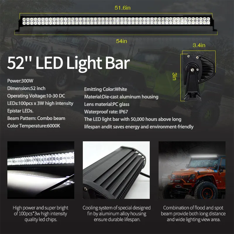 Review 3D 300W 52" Dual Row Combo Straight Offroad LED Light Bar +18W Work Light + Remote Control Switch F